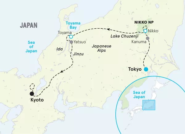 Spin along the fertile plains of the Jinzu and Ida Rivers • Partake in a tea ceremony and learn the steps of this highly stylized ritual • Gorgeous views of Toyama and its namesake bay abound as you pedal among mountain villages and rice terraces • A world of serenity awaits at our classic ryokan accommodations on the edge of the Northern Japanese Alps • Tour our extraordinary hotel and admire its world-class art collection • Don a yukata (robe) and savor a traditional dinner featuring seasonal ingredients.