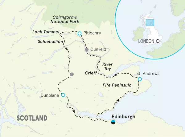 Bike through the pastoral Angus countryside, passing the world’s largest hedge • Cycle across rolling heathered moors and past wooded glens, admiring the soaring bens of Perthshire • Stop in historic Dunkeld and explore the summer home of Beatrix Potter • Take in the quintessential lochs, valleys and mountains of the Scottish Highlands • Fans of the show Outlander may recognize some of the dramatic places we pass in the shadow of Schiehallion, an isolated 3,500-foot mountain known as a Munro after the notable mountaineer, Sir Hugh Munro • Award-winning fine dining and a spa await at our loch-side hotel in beautiful Pitlochry • Perhaps savor a dram of single-malt Scotch before retiring to your well-appointed room.