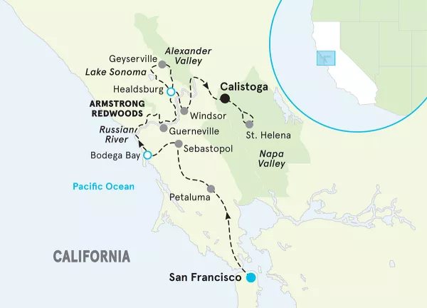 Pass rugged beaches before heading inland for a spin alongside the Russian River • A picnic lunch awaits beneath the giant trees in Armstrong Redwoods State Reserve • Wander through charming Healdsburg—its tasting rooms and restaurants might tempt you to stay awhile • Tasting opportunities abound in the Alexander and Dry Creek Valleys, where dozens of wineries line our route • Enjoy a classic Wine Country bike ride past manicured vineyards.