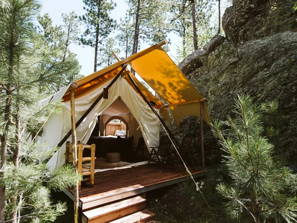 Praised by Condé Nast Traveler, this unique glamping resort is nestled among ponderosa pines on the site of a gold mining settlement, located within a few miles from Mount Rushmore.