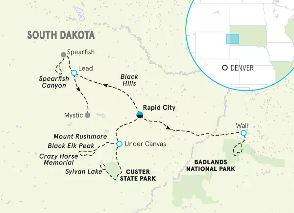 Traverse the heart of the Black Hills on two wheels while cruising the car-free, packed-gravel Mickelson Trail along a 19th-century railroad grade • Explore Custer State Park’s 71,000 acres of wilderness • Hit the trail—if you choose to hike to the summit of 7,242-foot Black Elk Peak, you’ll reach the highest point in the state! • Visit the yet-unfinished Crazy Horse Memorial, a modern-day engineering feat of epic proportions and currently the world’s largest mountain carving • Settle into your upscale safari-style tent and enjoy an evening of campfire camaraderie or serene stargazing • Relish a leisurely morning at camp, whether that’s lingering over coffee and a book or stretching your legs along the resort’s pine-lined walking trails • Take in the grandeur of the 60-foot sculptures carved into rock at Mount Rushmore, one of the country’s most iconic sites • After lunch we head back to lively Rapid City.