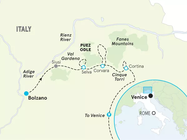 Explore an open-air World War I museum with a local guide • Traverse bucolic cirques, spotting marmots and edelweiss • See and be seen like the Italians do on the stylish Corso Italia in the posh resort town of Cortina d’Ampezzo, nestled below the peaks • Unwind at our historic and luxurious hotel • Take a final family spin along the scenic Boite River.