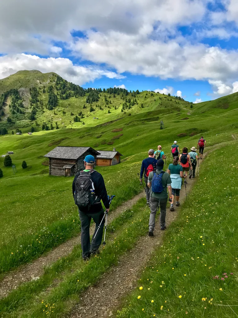 Start your weeklong adventure high in the Italian Dolomites, where trails beckon you to hike in the shadows of the Schlern massif • Enjoy a scenic gondola ride up to the Seiser Alm, Europe’s highest alpine plateau • Fuel up along the hike at rustic mountain huts • Admire panoramic vistas of the glowing green valley below • Our welcome dinner showcases the Dolomites’ delightful fusion cuisine • Savor a tasting of unique local wines and relax in our mountaintop retreat.