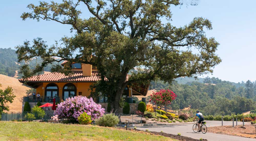 To me, Hanna Winery in Sonoma County's Alexander Valley AVA feels reminiscent of a family-owned villa in Europe. Perched on a hilltop with yellow ocher-painted walls, a terracotta-shingled roof and a sprawling heritage oak tree that casts a bit of welcome shade over every grateful cyclist who arrives at this incredibly scenic spot. Hanna Winery was founded in 1985 after Dr. Elias Hanna and his daughter Christine had been making homemade wine on their 12 acres in the Russian River Valley since the 1970s. Christine Hanna manages the winery today, which has expanded to 600 acres in Russian River, Alexander and Sonoma Valleys. Backroads visits their Alexander Valley Tasting Room, the ideal location to enjoy a glass of their iconic Sauvignon Blanc while relaxing your bike legs on the deck in the shade of that magnificent oak tree.