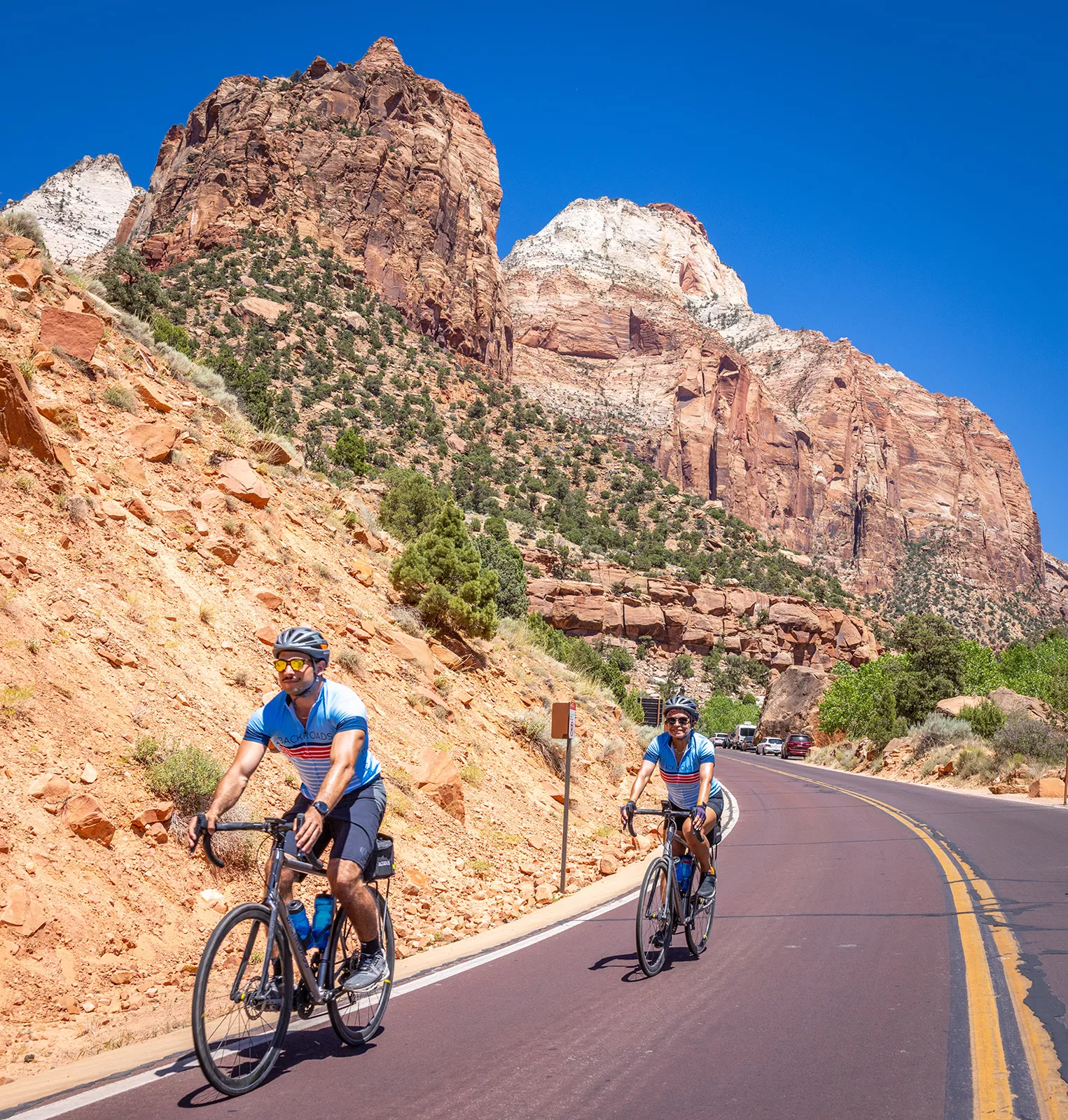 Ride quiet paths through a wide desert valley dotted with spires and sandstone towers en route to Zion National Park • Explore Zion’s striking landscapes on your terms—opt for a shady cottonwood stroll, a heart-pumping ridge hike or wade into the legendary Narrows • Wander through the inviting streets of Springdale or stop by the Zion Human History Museum for a deeper sense of place • Unplug at our peaceful hideaway, where evenings mean stars, stories and classic s’mores • Walk the banks of the Virgin River beneath towering Navajo sandstone walls—an awe-filled finale to your journey • Celebrate with a farewell dinner.