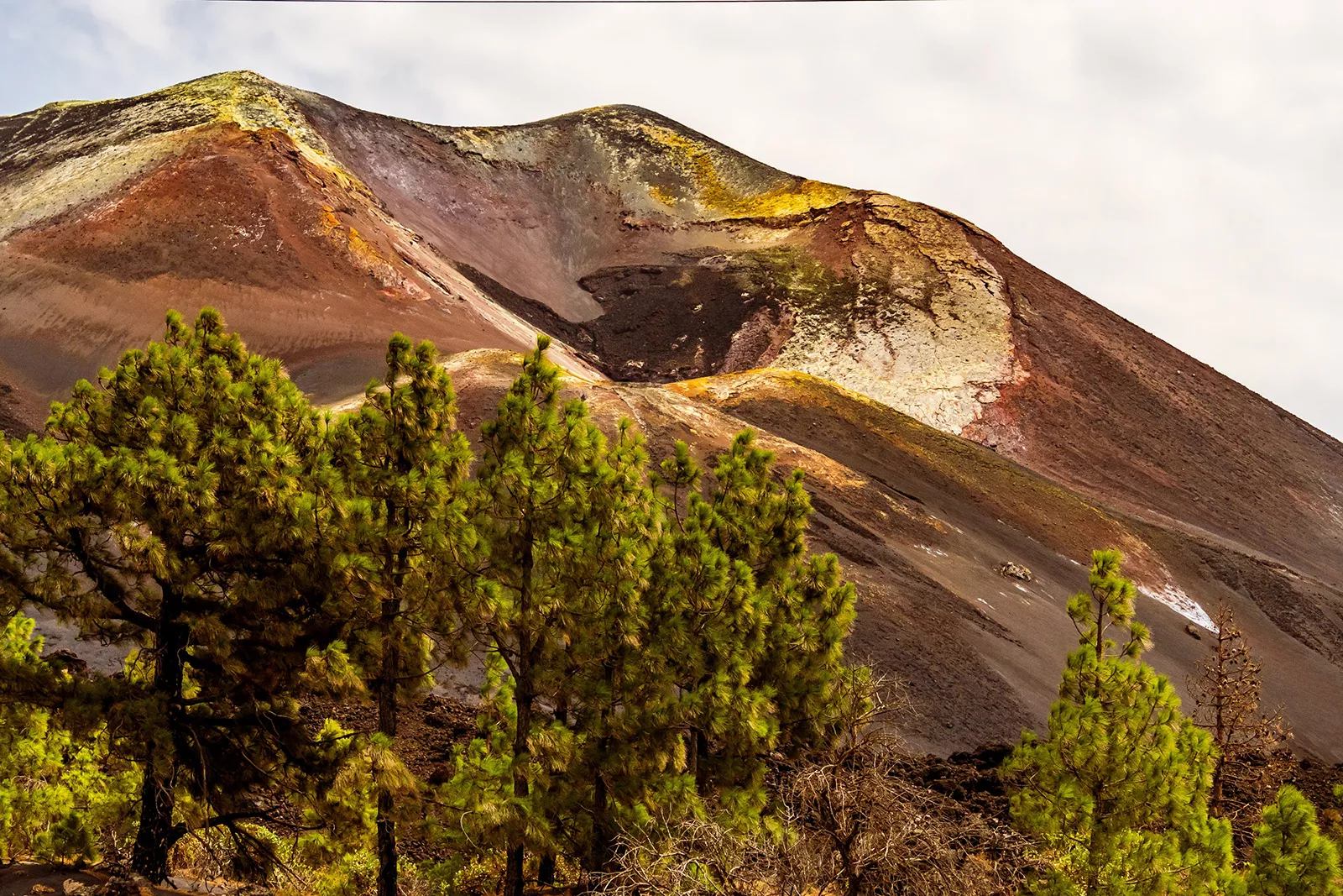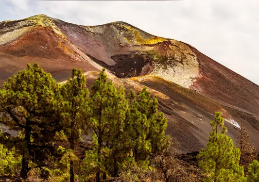 ¡Bienvenidos! Amid endemic pine trees and sloping red and green mountains, explore the massive ten-kilometer-wide volcanic crater of Tajogaite volcano • Hike past traditional villages and banana plantations • Sip a glass of local wine and dine on Canarian haute cuisine at a restaurant that's earned a Sol, the Spanish equivalent of a Michelin star • Weave between craters, ancient lava flows and verdant forest on the Volcano Route • Relax by the pool or explore the lush botanical gardens at our hotel • Seated outdoors, with excellent views of the city and sea, taste some of the island's most emblematic dishes at a cozy dinner in town.