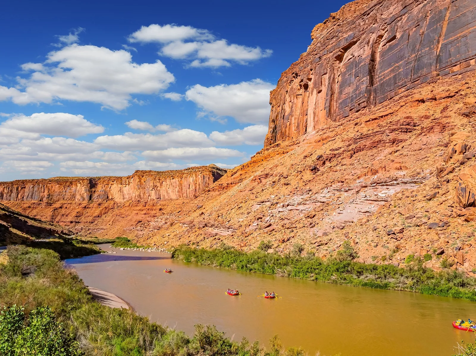 Large river next to a canyon, with people in red rafts paddling through the river